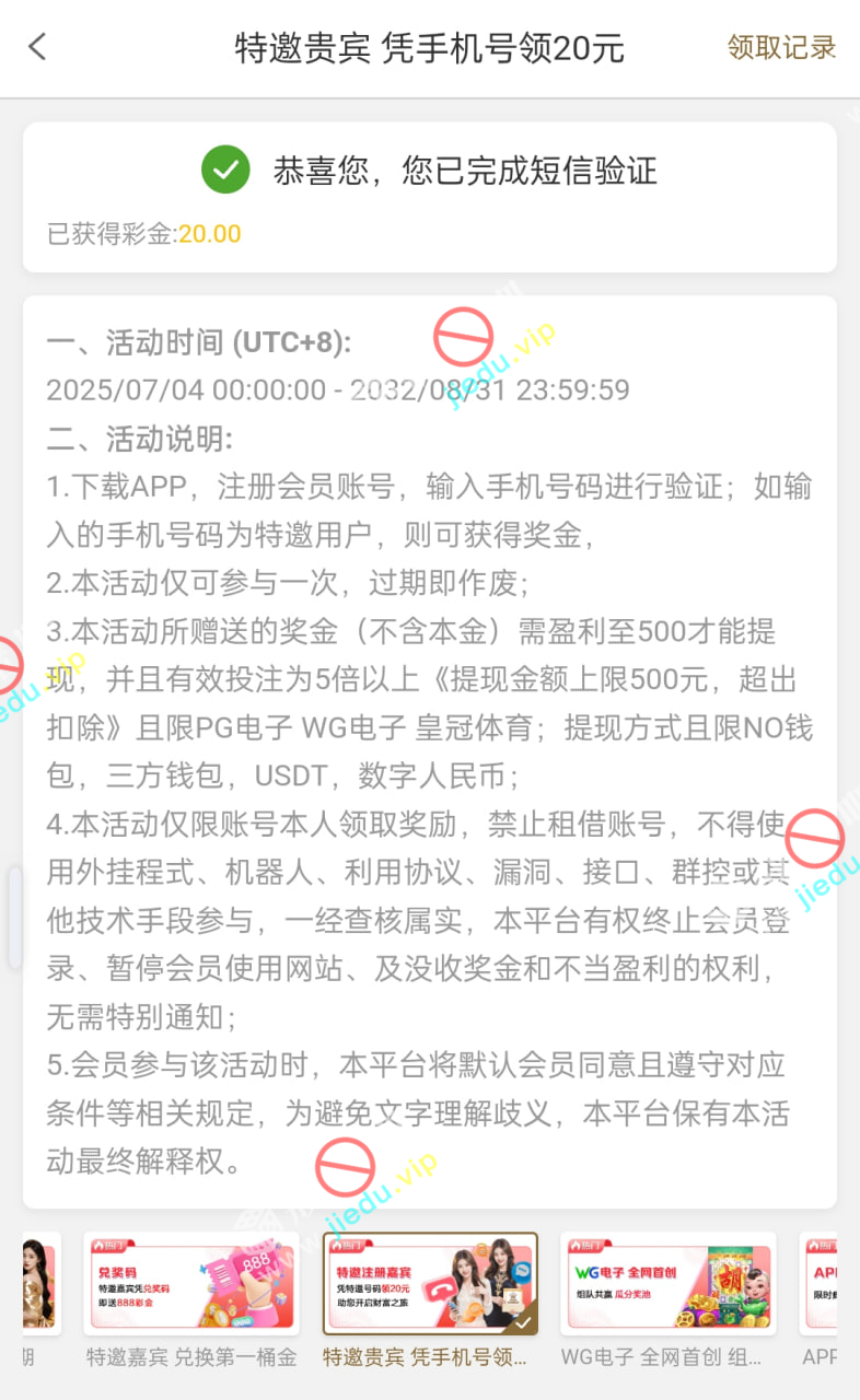 大厅自助验证手机号,是特邀就秒20,我是注册半个多月才打电话,漏接的可以去试试。