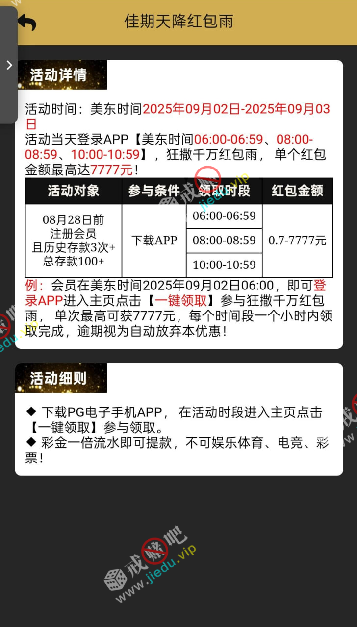9月2-3日18.20.22点红包雨,充值过3次总额大于101可以参与即可。