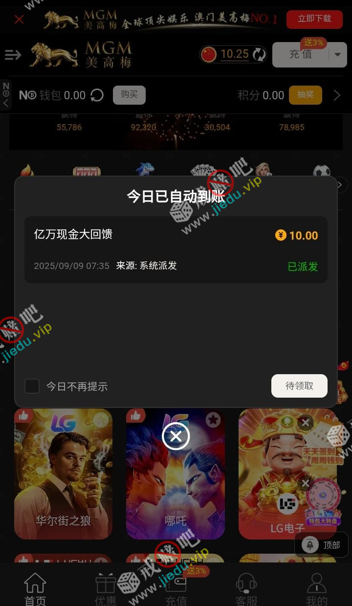 逢 9 回馈彩金,以前充过娱乐过的老玩家都可以去看看,领到的留图!我已经吃了 100,最底提 50!