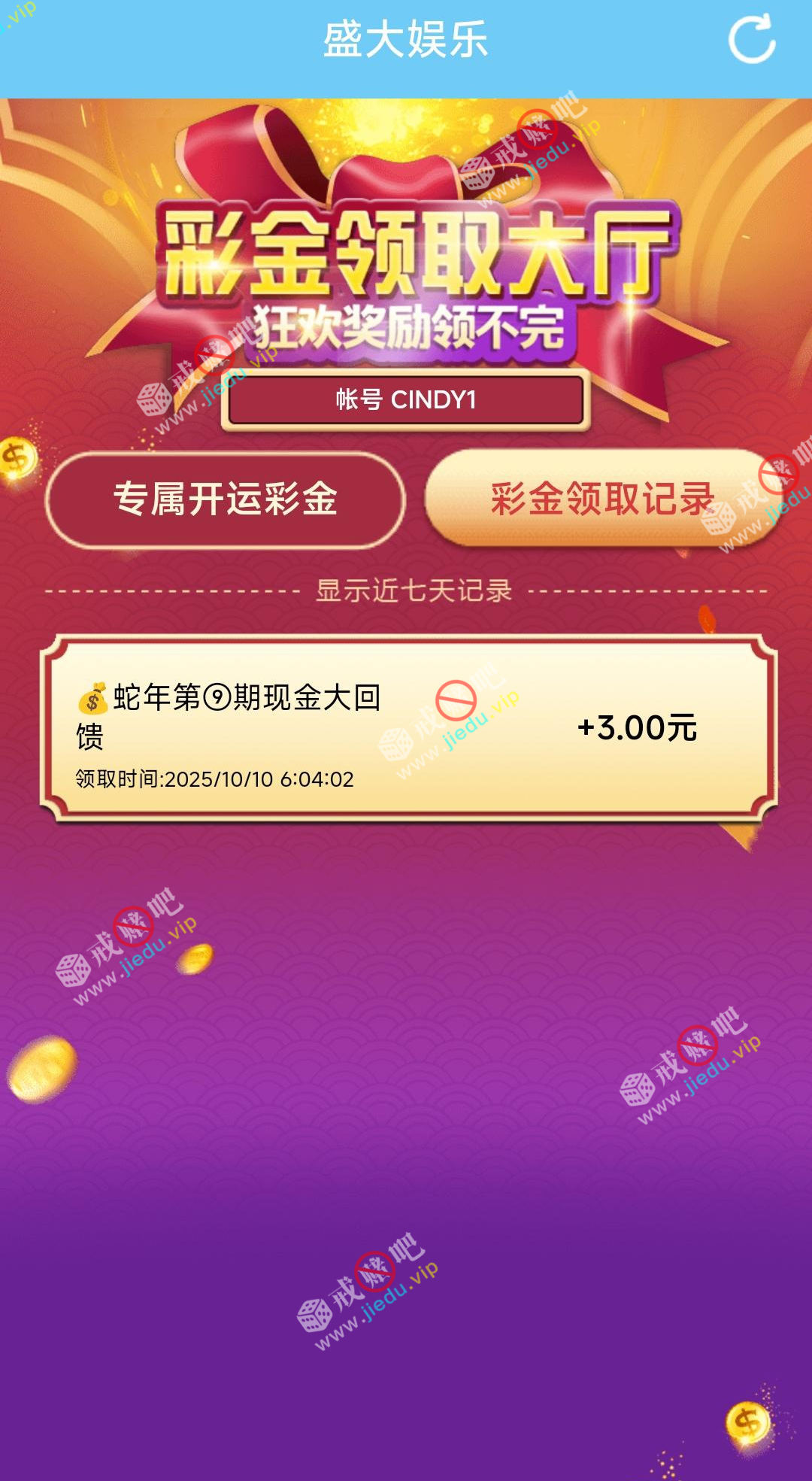 盛大点彩金大厅专属彩金回馈我回馈了3元都去看看。