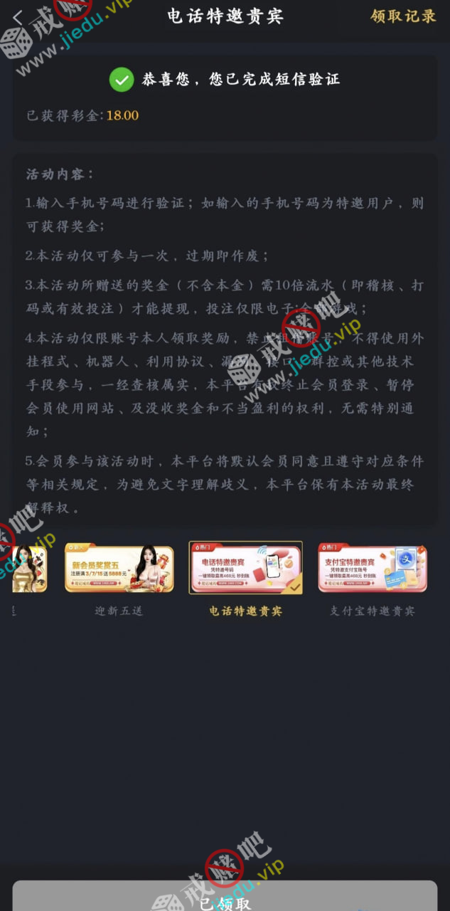 电话特邀送18彩金,有号的兄弟们,可以去试试